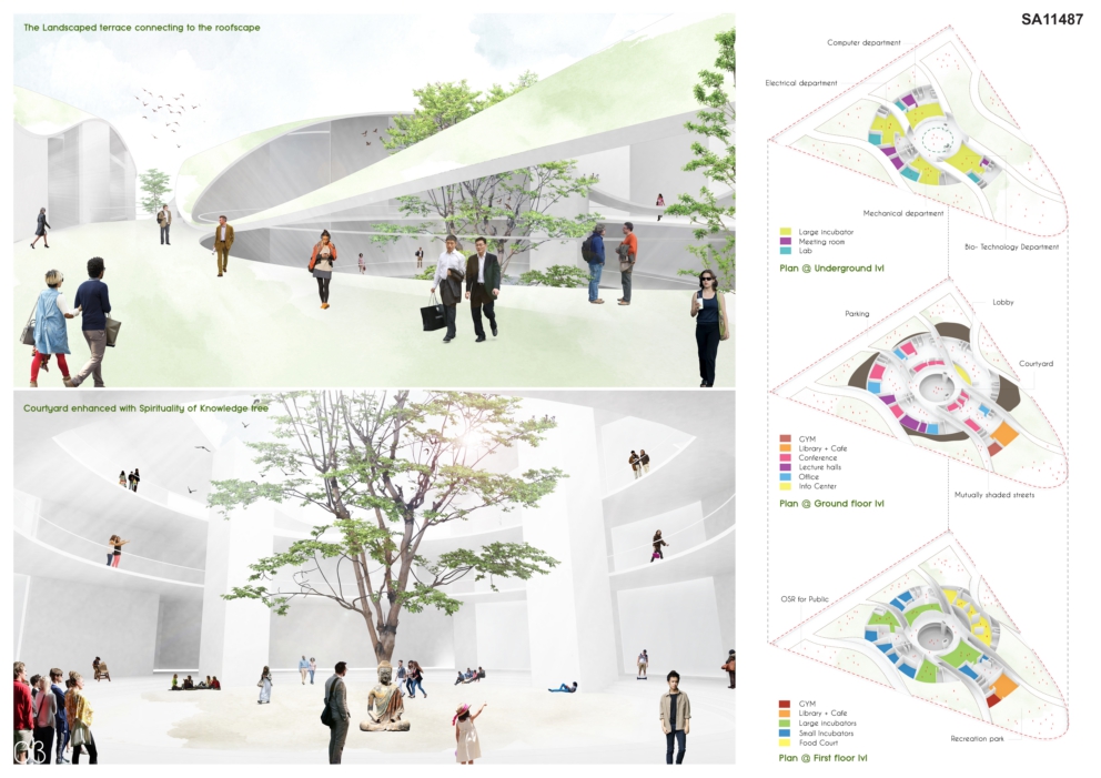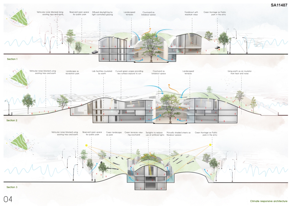 Redefining sustainability – Can architecture be defined by the landscape? Can landscape in itself be an identity? Can the artificial wall amongst people be broken? The idea was inspired from the context, the site and the people. The essence of the CONTEXT was retained by creating a “landscape + architecture” where architecture remained subtle while the landscape overpowered. The essence of the SITE was established by creating a “new identity”. The PEOPLE or users of the research park majorly lacked the sense of “interaction”, hence by breaking such introvercies, involvement was emphasized. Research [in a] park was hence envisioned, thereby redefining sustainability.