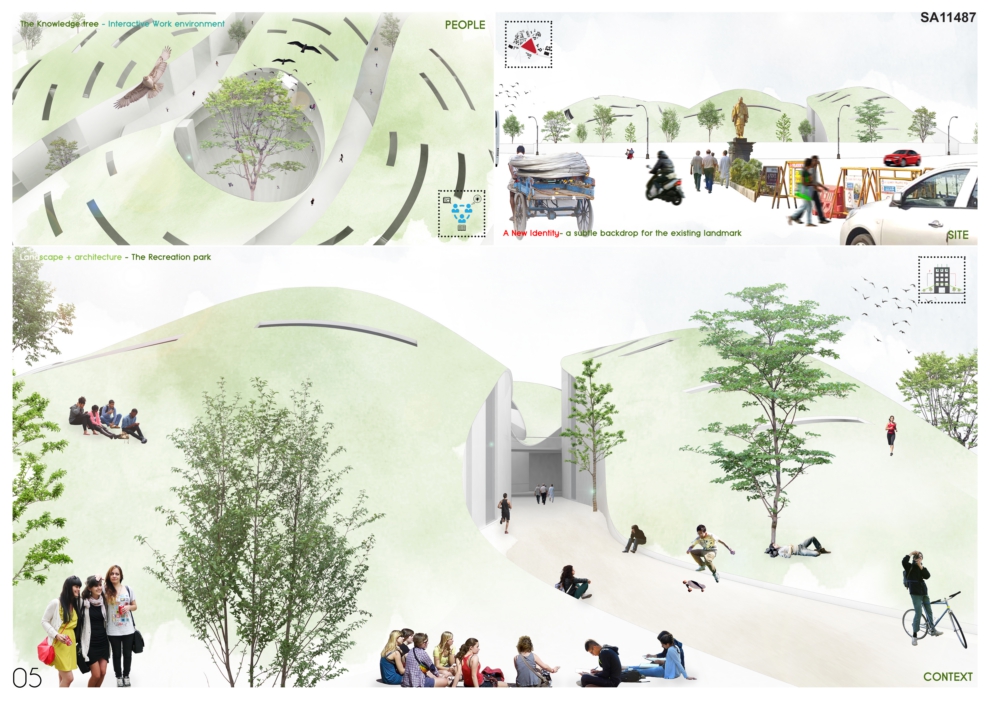 An interactive research park was proposed that would cater to the various institutions around. The idea was to maintain the essence of the green pocket of the city by using landscape + architecture approach.