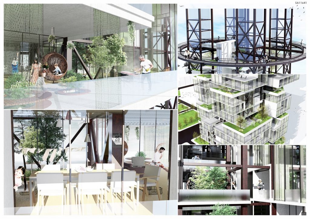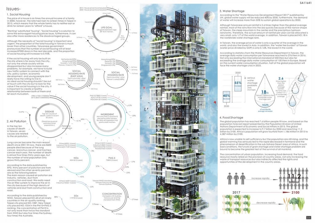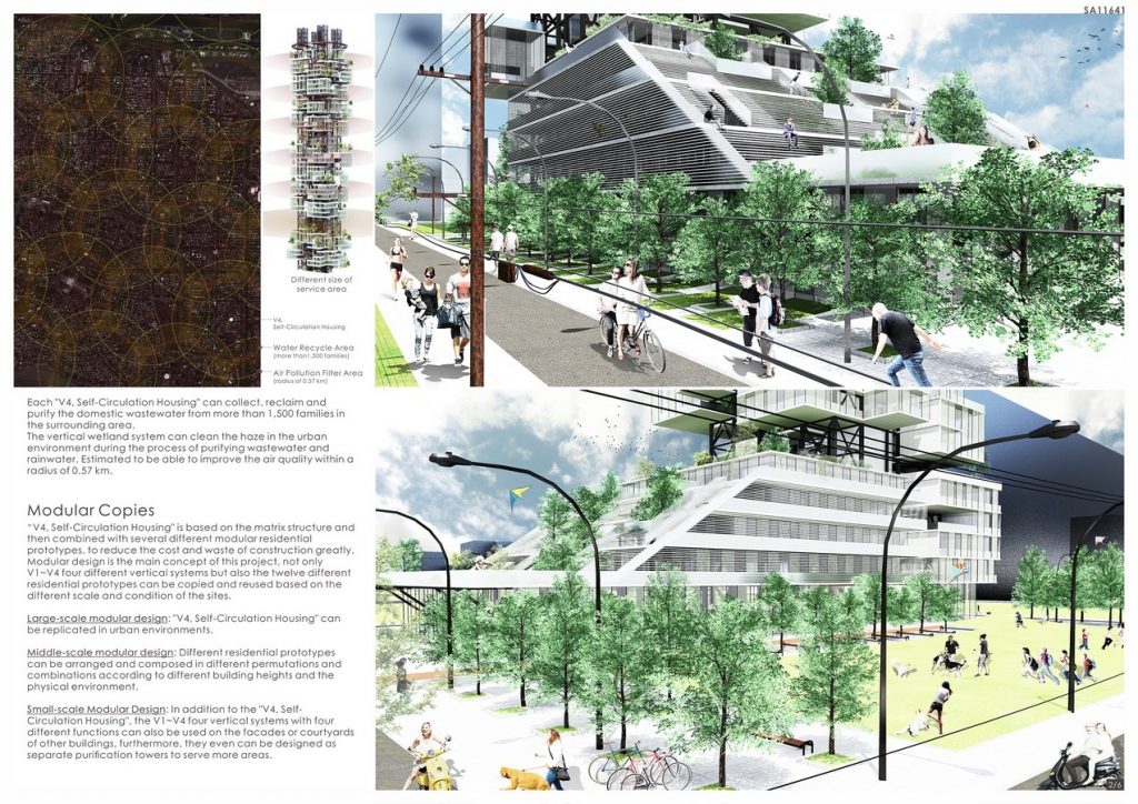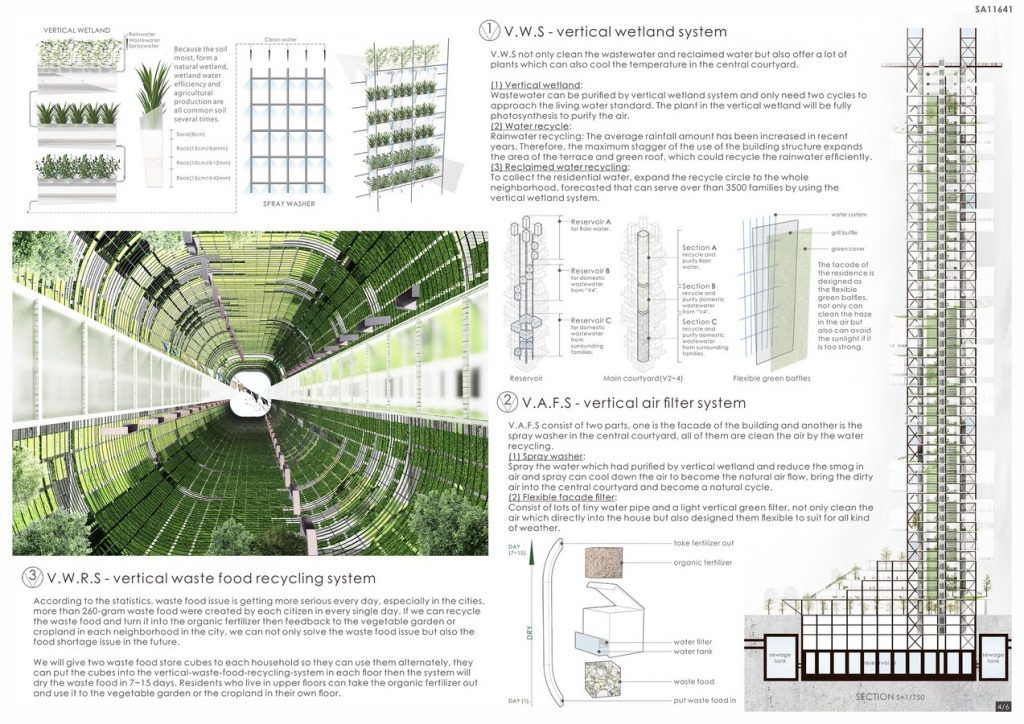 “V4” housing was combined with four vertical systems, which are (1) vertical-village, (2) vertical-wetland-system, (3) vertical-waste-food-recycling-system and (4) vertical-air-filter-system. Not only provide more living space for the citizens but also recycle the rainwater, waste water, waste food then resubmits to the city area as the clean water and organic fertilizer. Furthermore, it can also clean the haze and give back the clean air to the city. In the process of the water recycling, the vertical wetland system can also provide the organic vegetables for the city.