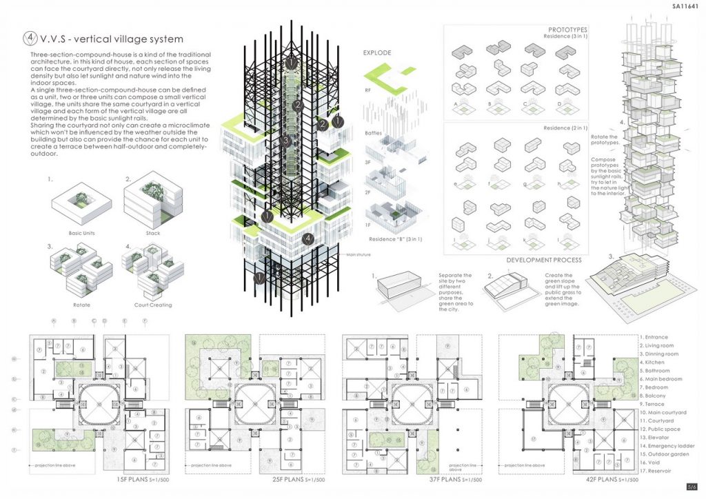 Modular design is the main concept of this project, not only V1~V4 four different vertical systems but also the twelve different residential prototypes can be copied and reused based on the different scale and condition of the sites.