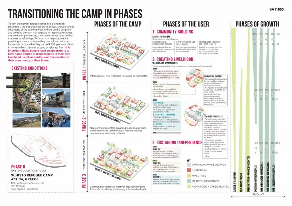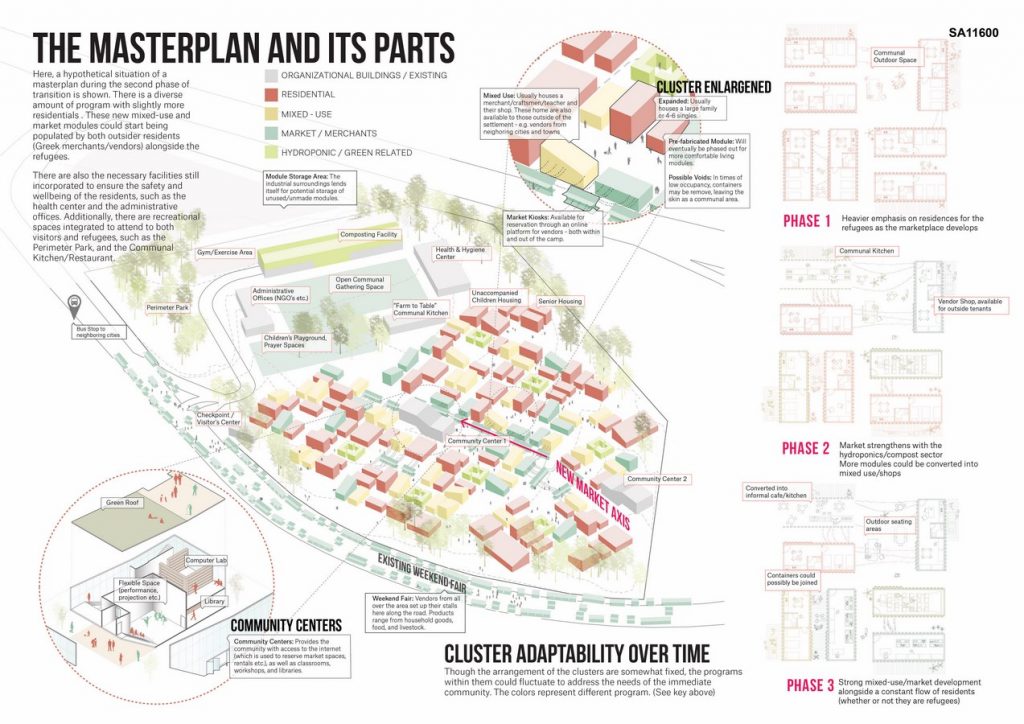Situated on the outskirts of two larger cities, Athens and Piraeus, the existing Schisto Refugee Camp is nestled in the middle of an industrial park close to nowhere. By integrating a marketplace as the main program of the site, the camp potentially attracts vendors from the neighboring communities of Attica. Following the narrative of the weekly bazaar as the source of income and way of life, the relationship between the vendors and refugees could become linked and mutually beneficial.