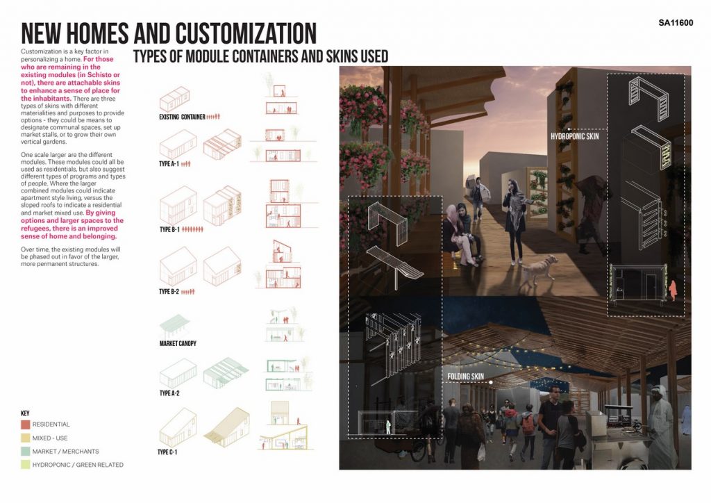 Each container home is provided with a variety of opportunities to further customize their new space, such as the possibility to create their own community spaces, storefronts, or even vertical gardens for produce through an attachable mechanism.